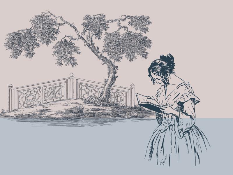 Stregtegning af 1800-tals-dame og bro